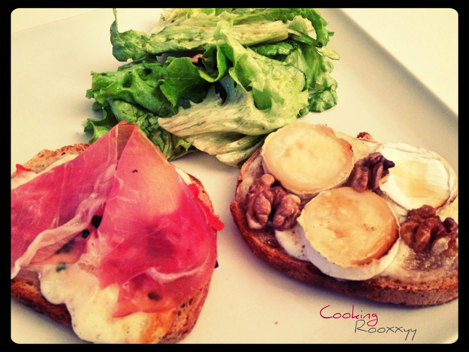 Pour ma part, j'ai un peu revisité les bruschettas classiques et j'en ai préparé deux différentes : une assez classique aux tomates, mozzarelle & jambon cru, l'autre au chèvre, miel et noix (une TUERIE pour les amateurs de ce mélange ! ;))