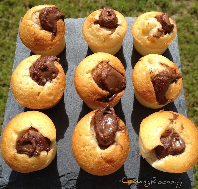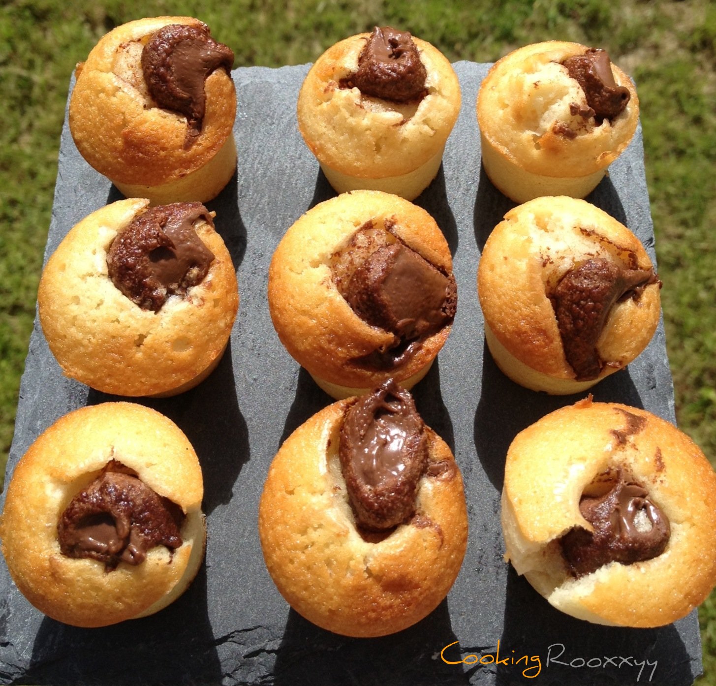Versez la pâte obtenue dans des moules à financiers (si ils sont en silicone, vous n'avez pas besoin de les beurrer) et déposez deux noisettes de nutella.