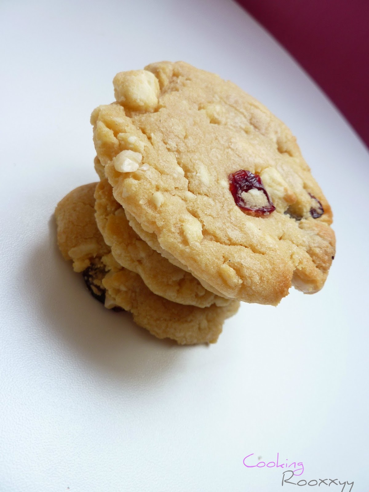 Pour ma part j'ai réalisé ces cookies avec du chocolat blanc, des amandes et des cranberries et voici ce que ça a donné : :)