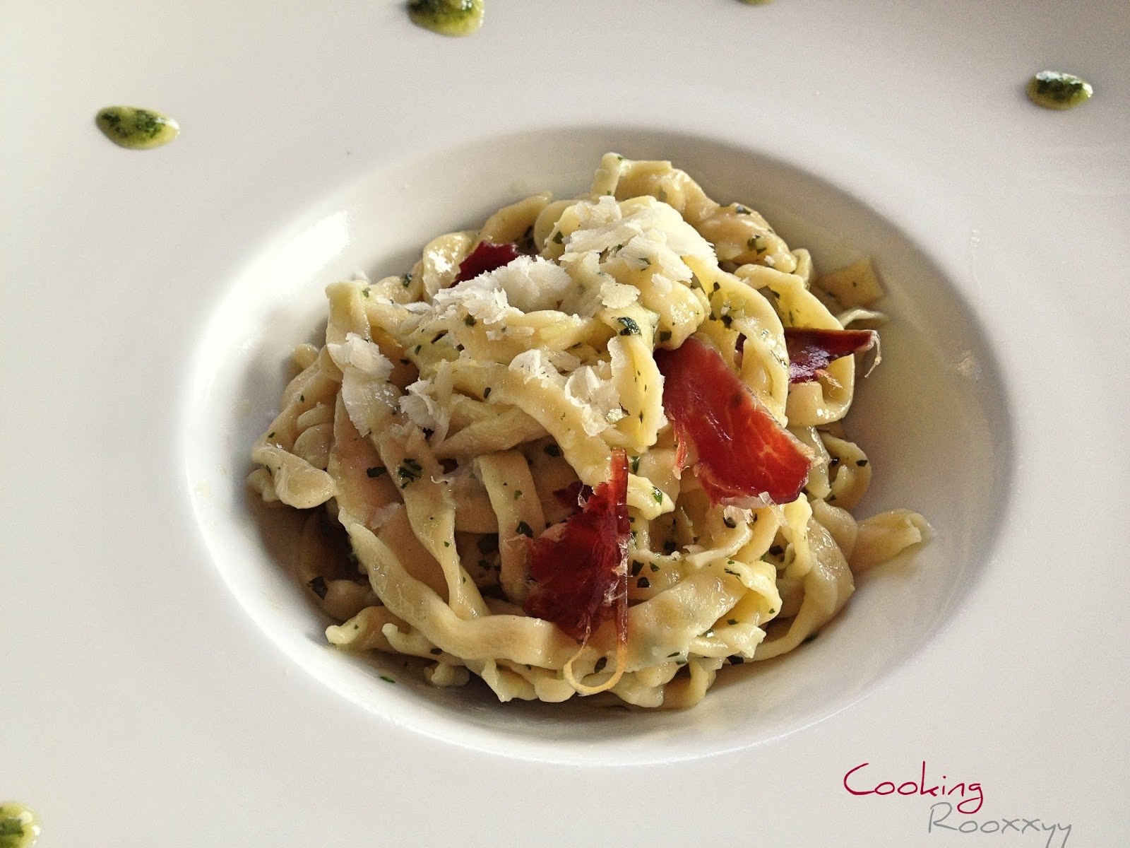 Comme je vous avez prévenu dans mon article expliquant comment faire ses pâtes fraiches maison : ici, je vais vous présenter plusieurs façons de les accompagner. Aujourd'hui, il s'agit de tagliatelles maison au pesto (maison également) & au jambon cru