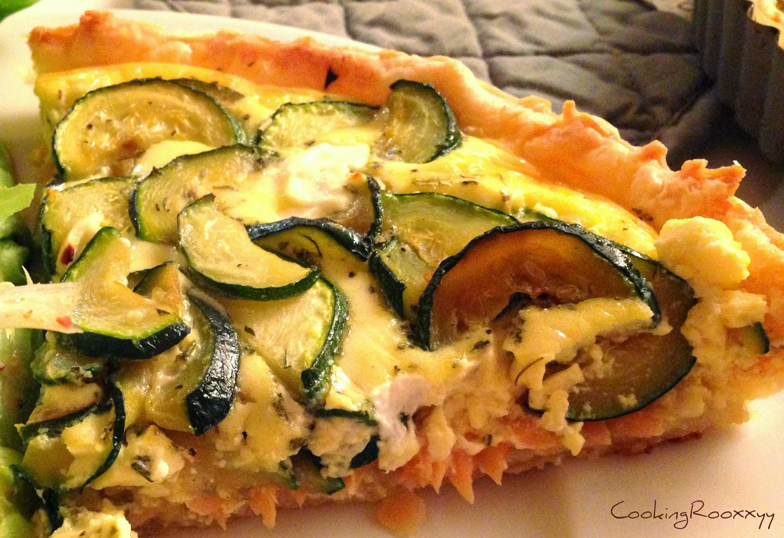 - Lorsque la pate est précuite, la sortir et étaler au fond les tranches de saumon fumé. Par dessus, déposer les courgettes et recouvrir du mélange avec les œufs et les produits laitier.