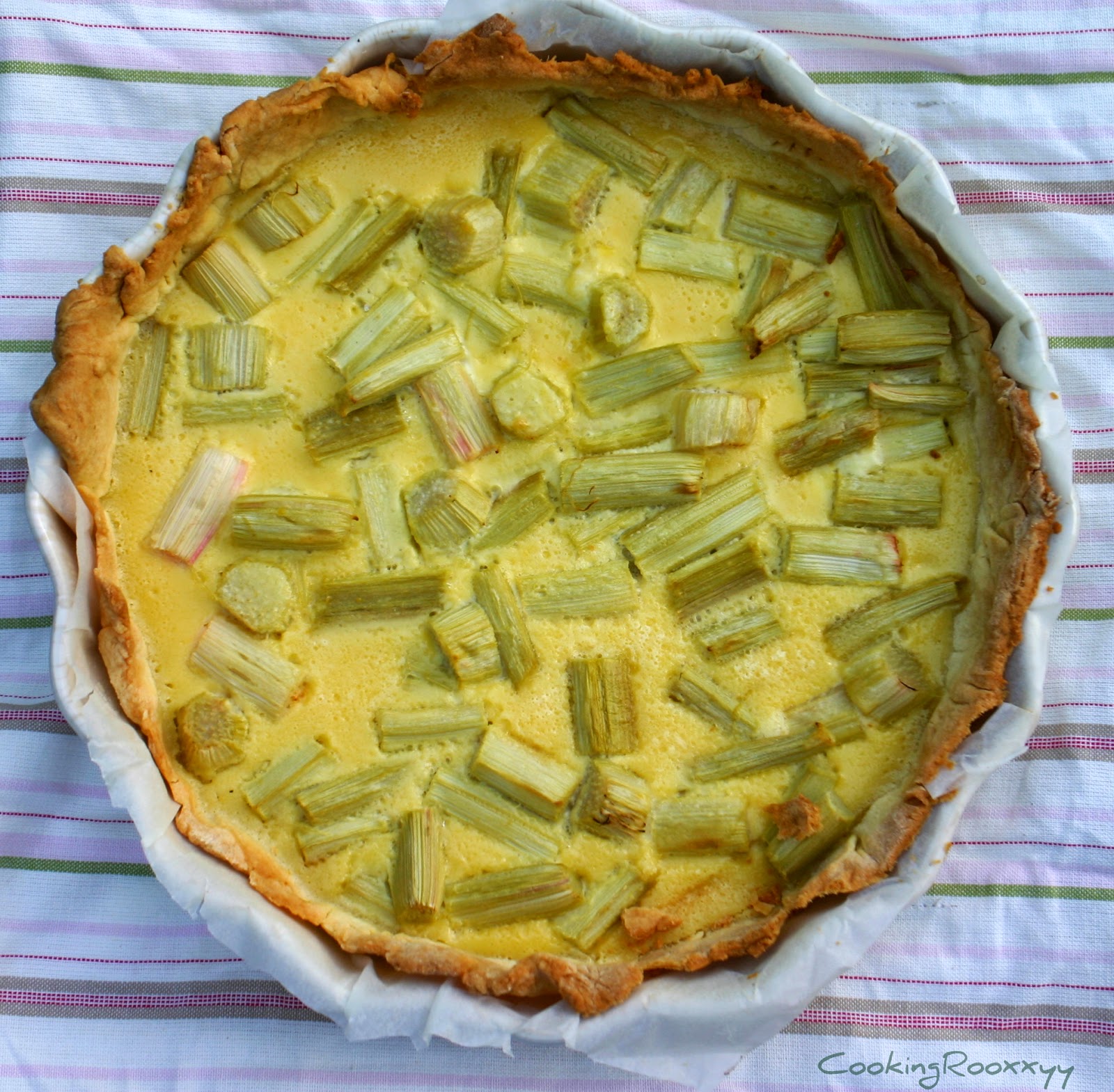 - Déposer ensuite la rhubarbe et son jus au fond de la pâte. Verser ensuite votre mélange oeuf-sucre-crème fraiche par dessus.